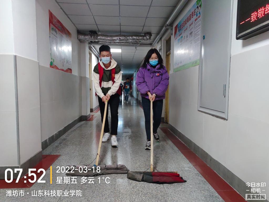 自3月15日起学院实行封闭管理,公寓公共区域卫生清扫面临人手短缺的压力,我系入党积极分子主动提议承担起学生公寓走廊卫生清洁工作,他们自行组队,科学分工,制定好值班表,每天早晚两次,对公寓地面进行清扫、走廊进行清理,不放过每一个角落。在清扫卫生的同时同学们还注意排查管道和线路,及时上报存在问题,确保消除安全隐患,展现了入党积极分子不怕脏、不怕苦、不怕累,敢于冲在最前面,敢于抢挑重担的精神面貌。