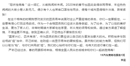 疫情爆发后,必威BETWAY西汉姆联的许多团员青年们冲锋在抗“疫”斗争的第一线,他们积极报名志愿者,帮助社区、医院承担力所能及的一部分工作。有些同学虽不能上“前线”,但积极响应团总支的号召,同学们以笔为枪,把想对身在武汉的团兄团妹说的心里话,写成深情文章,为在武汉的团员青年们鼓劲加油,希望他们坚定信心,共同助力打赢疫情防控阻击战。