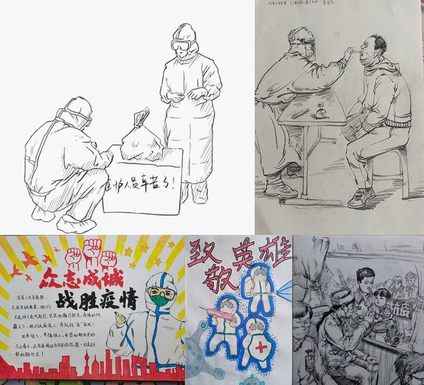 在一段段可歌可泣的战“疫”故事感召下,同学们迸发出巨大的创作热情,活动反响热烈,作品形式多样,一笔一划中满溢出对防疫人员的由衷感谢与崇高敬意。有的同学将感激之情倾注于画中,用实际行动向白衣天使表示由衷的崇敬;有的同学以笔为“枪”,用铿锵有力的书法表达出战胜疫情的坚定决心,每一副作品都充分展现出新时代大学生的青春风采和同心战疫的决心。
