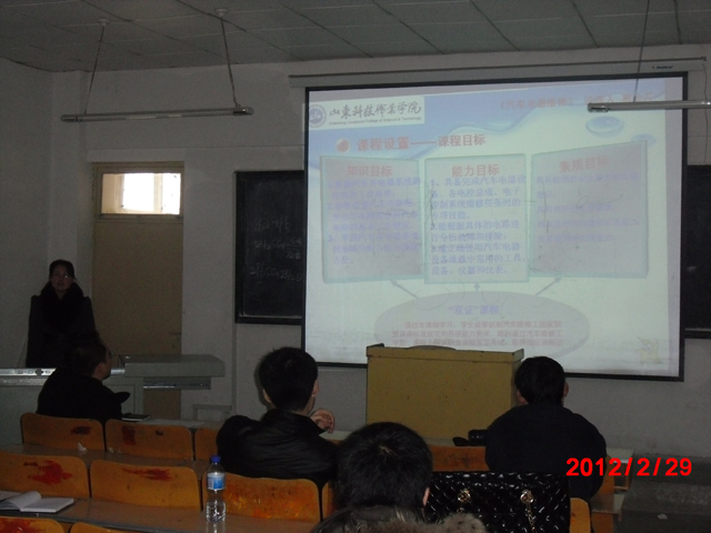 为加强教学实践研究,提升教师教学能力,2012年2月29日汽车工程学院在1号教学楼A301举办“汽车工程学院专业教师说课”比赛。比赛由汽车工程学院院长张振东主持,全体任课教师参加。